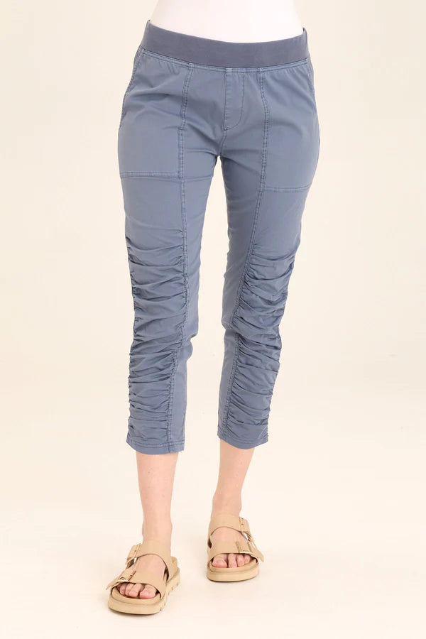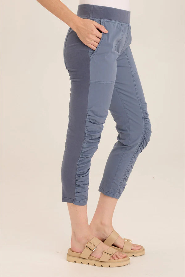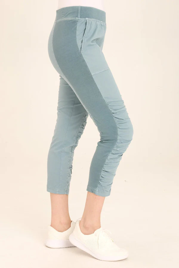 A variation on a classic. This crop features an elastic pull-on waistband, two front pockets, ruching on leg front, and jersey side inserts for an impeccable fit.