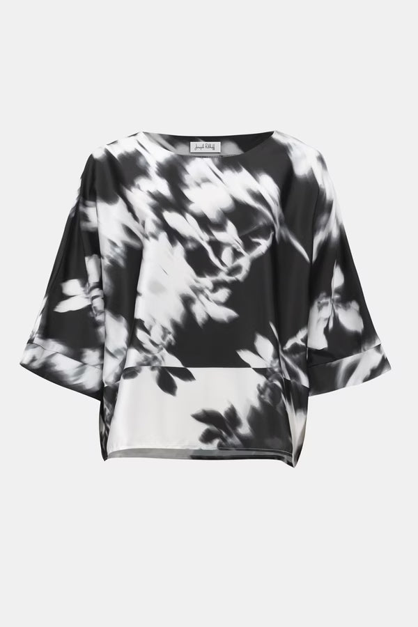 Introducing the Joseph Ribkoff pullover, a perfect blend of chic and casual sophistication. This relaxed fit, hip-length top features a boat neck and long, straight sleeves for comfort and style. Adorned with jewel embellishments and a unique floral and abstract pattern, it’s ideal for both casual outings and office wear. Embrace effortless elegance with this versatile piece.