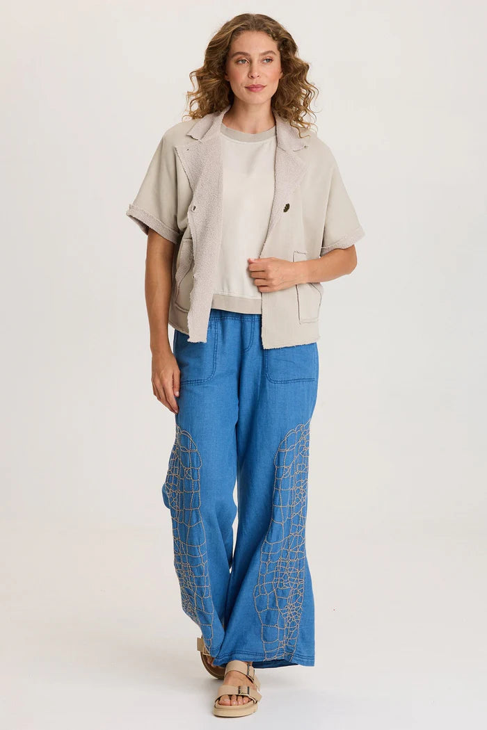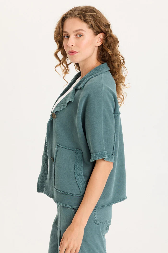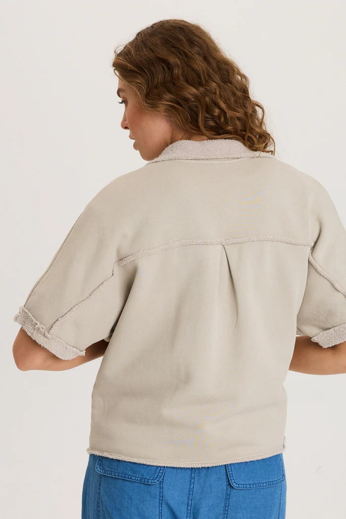 Cozy up with this little capelet! Featuring a double breasted look with front pockets and reverse fleece details.