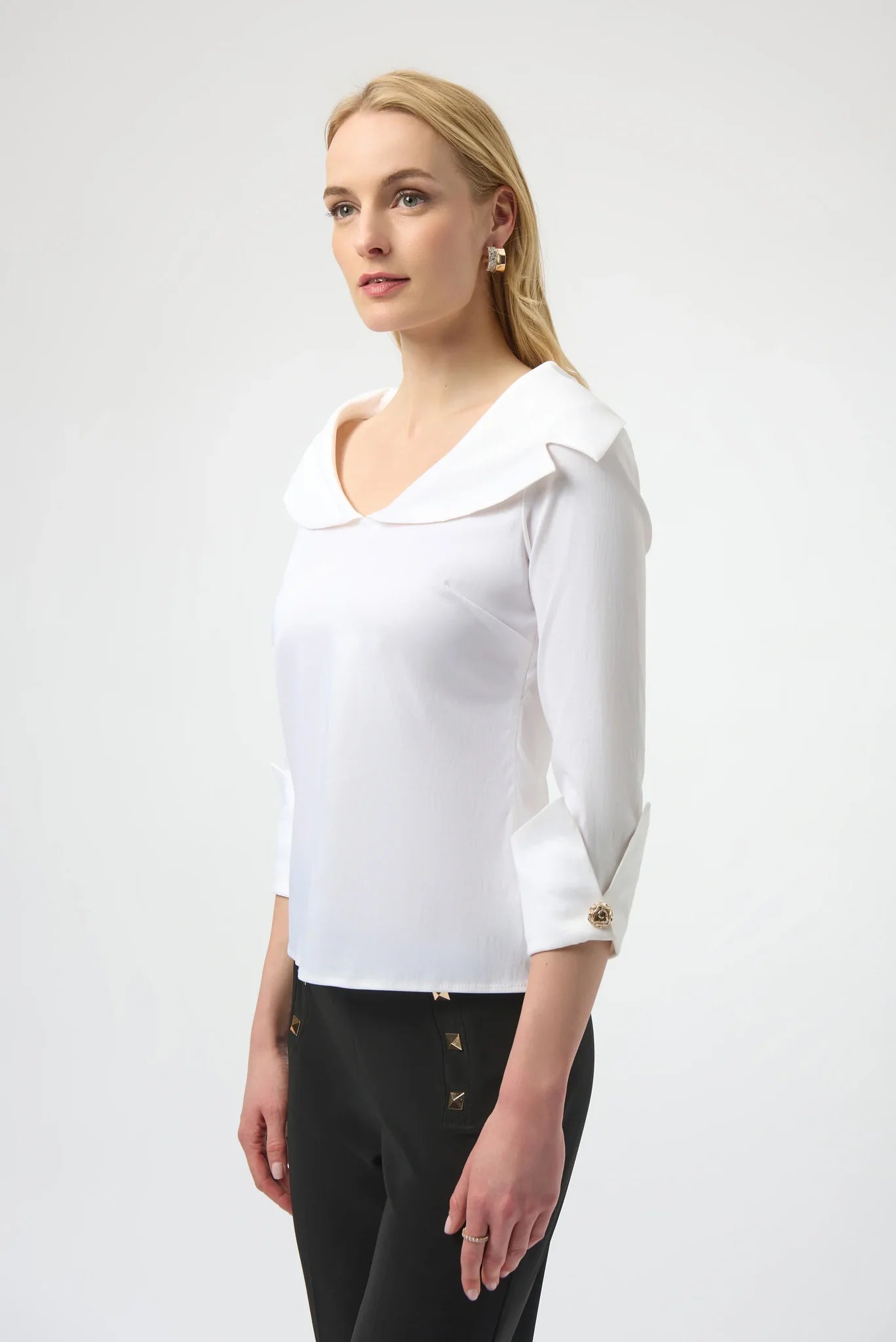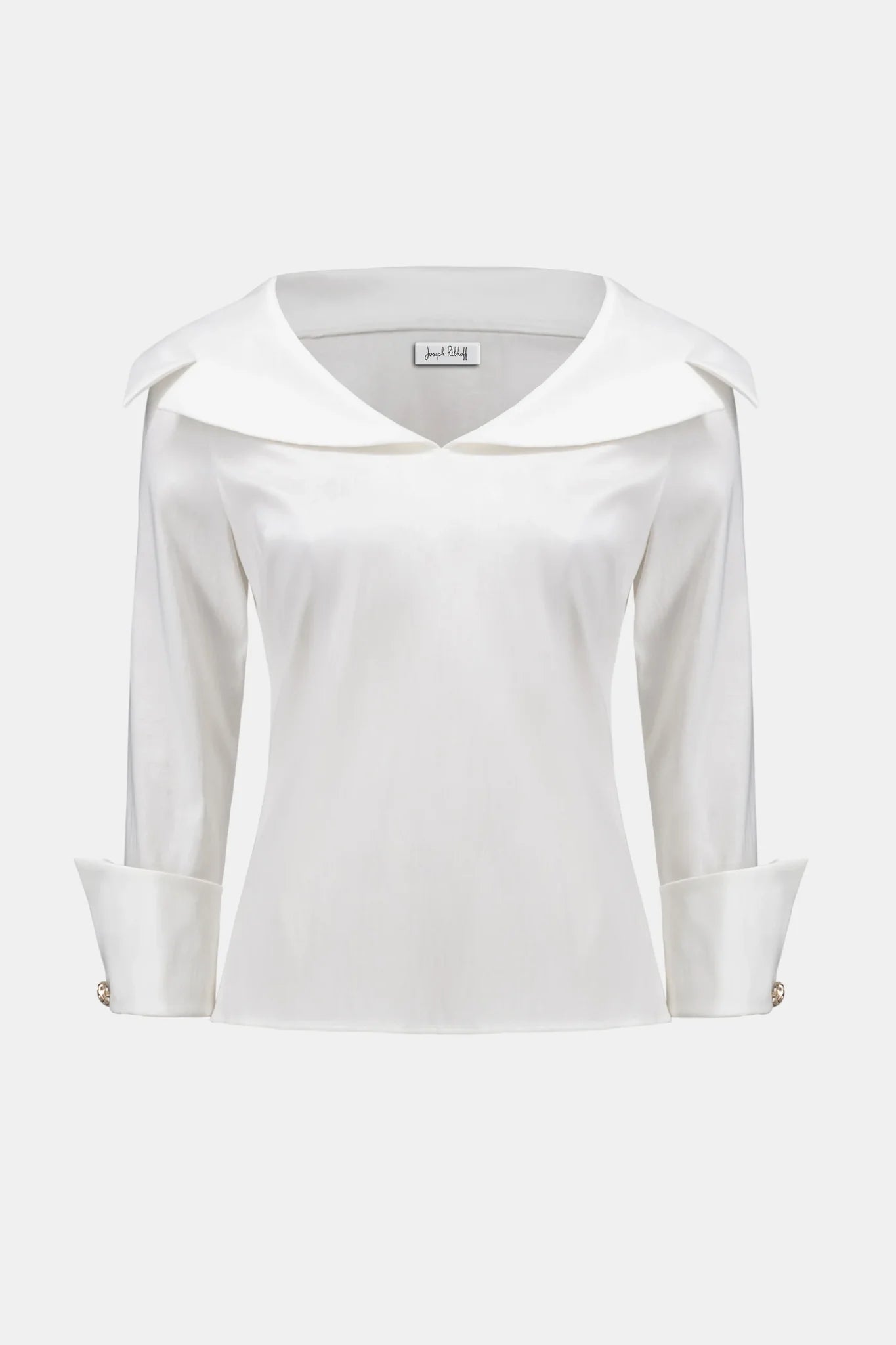 This stretch taffeta top presents an exquisite fitted silhouette boasting a dramatic over-the-shoulder notched collar. Delicate rose button accents grace the folded cuffs of its three-quarter sleeves, while an invisible side zipper ensures a seamless finish.