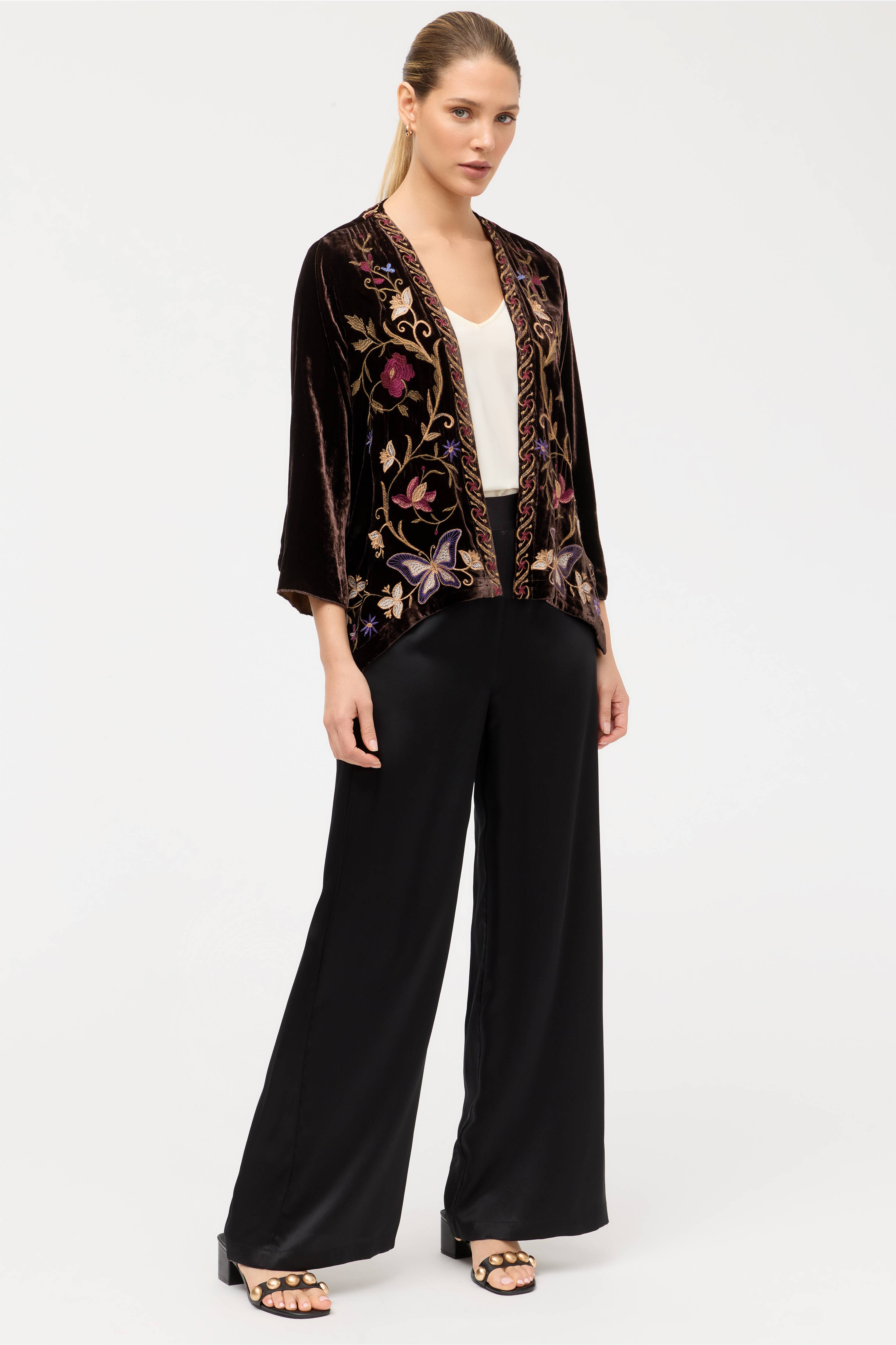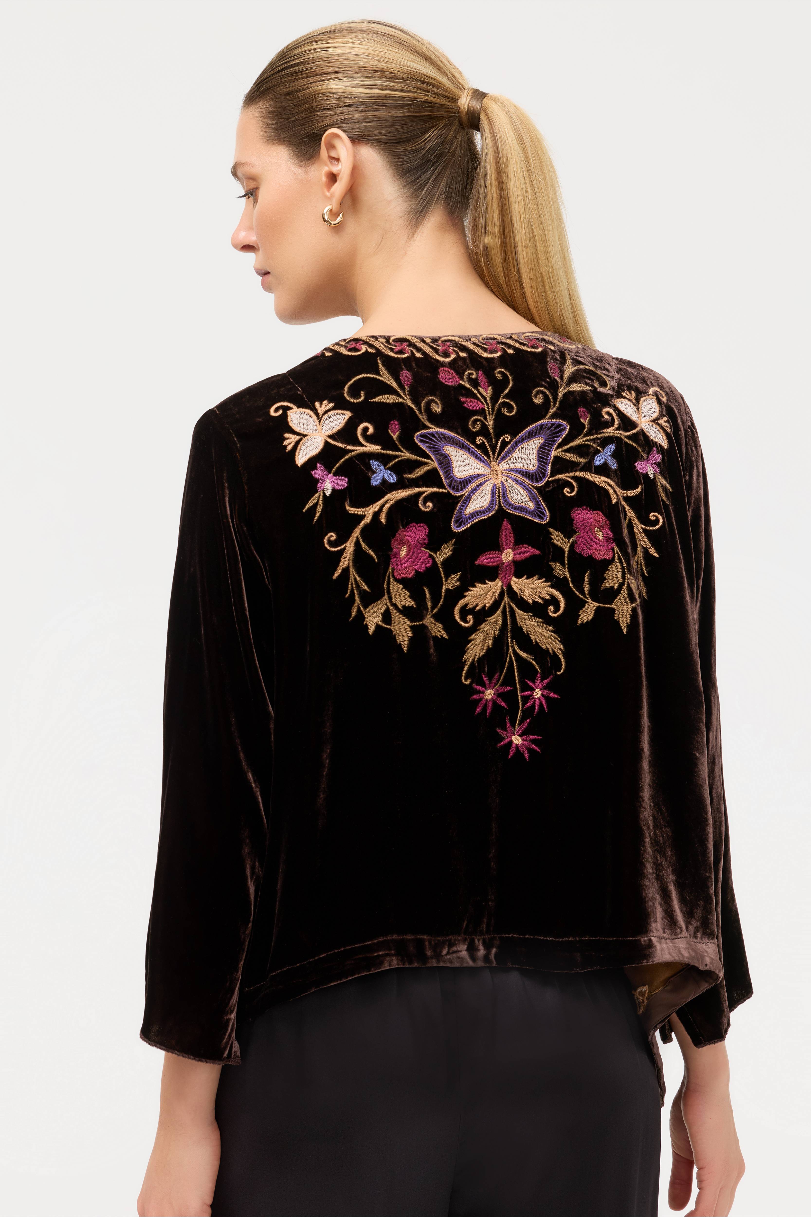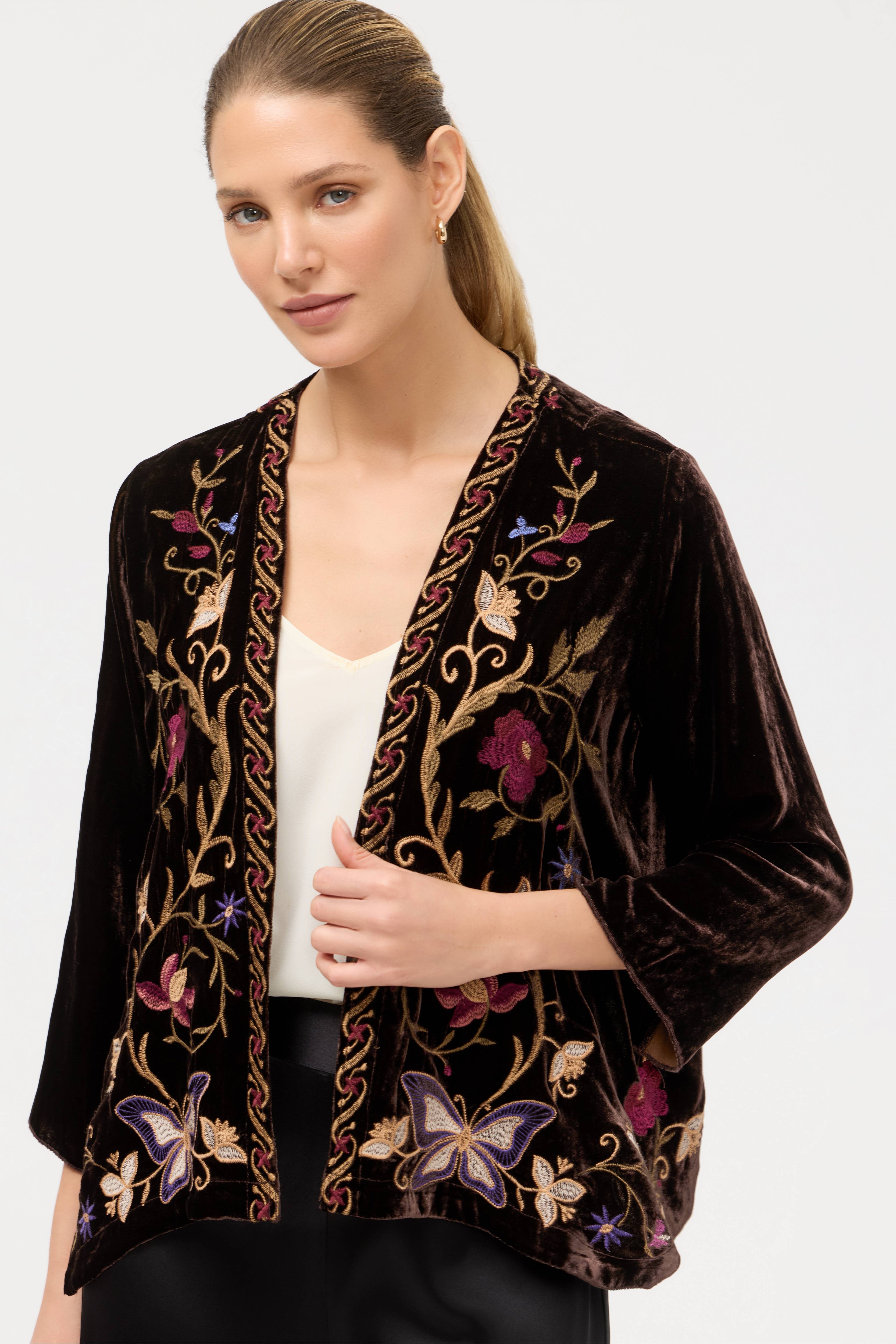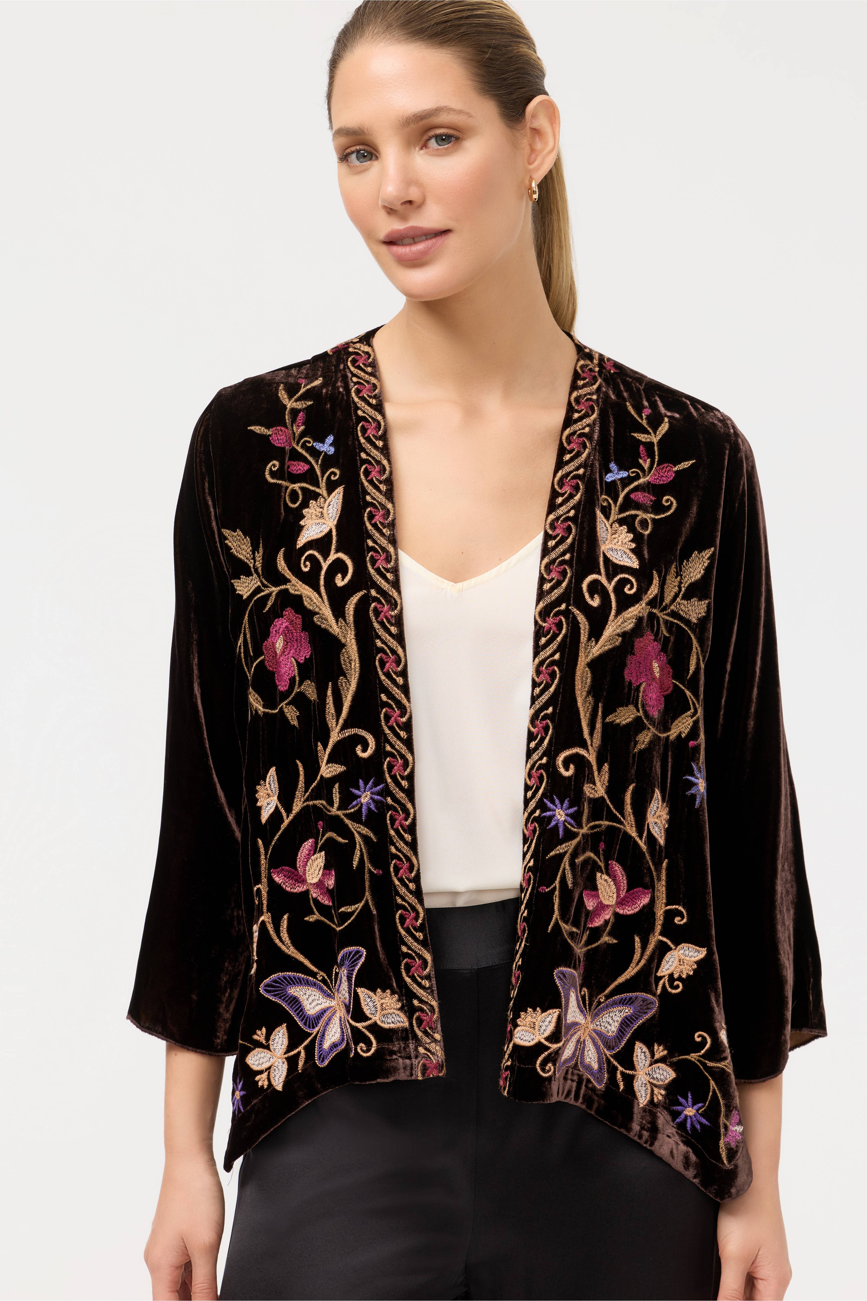 Crafted from a soft silk blend, the Carmina Velvet Bolero is accented by intricate embroidered florals in vibrant color. Designed with an open front with a curved hemline, this jacket features a contrasting trim and long sleeves. Layer over a coordinating sheath dress and pair with strappy heels for an elegant dinner out.