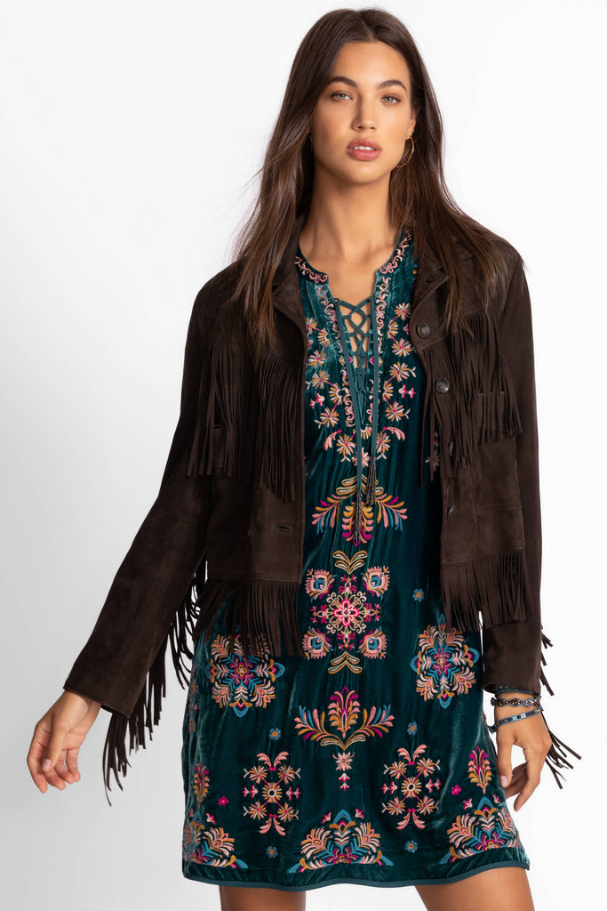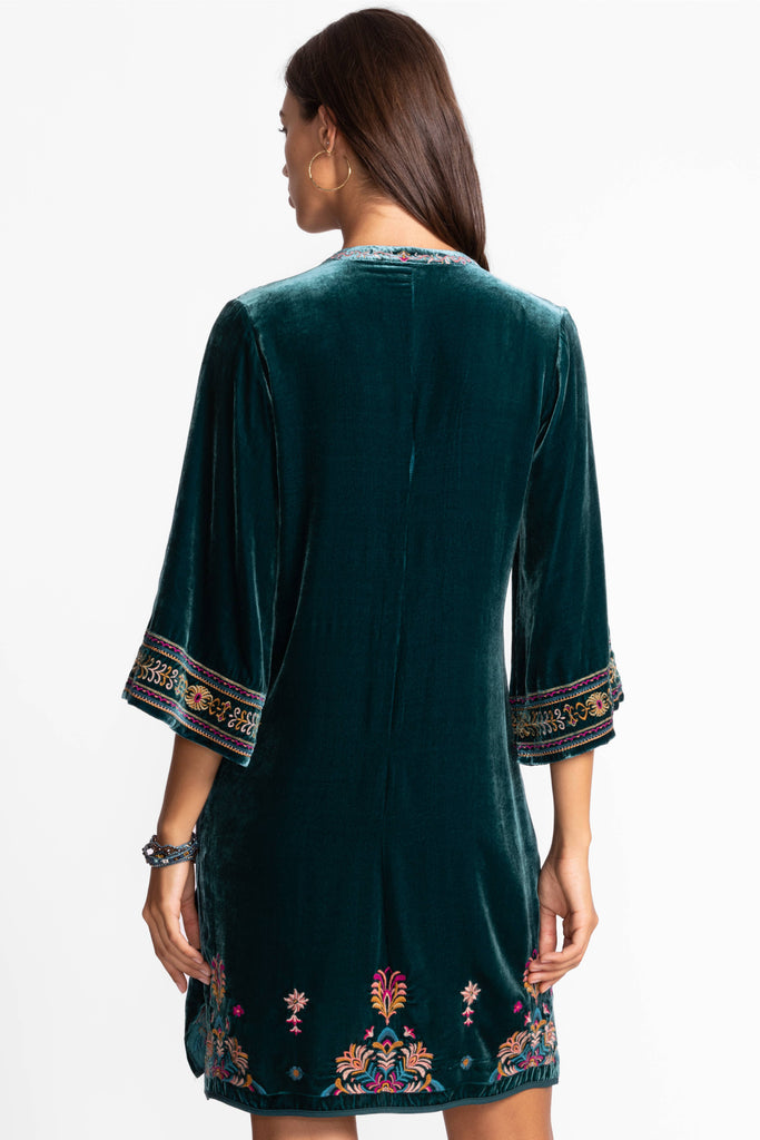 Crafted from a unique silk blend, the Brandi Velvet Tie Front Kimono Dress expertly blends comfort and elevated style. Designed with a split V-neckline with a beaded tassel tie, this dress is finished with wide kimono sleeves and intricate embroidered detailing in vibrant colors. Pair with wedge heels and bold jewelry for a resort-inspired ensemble.