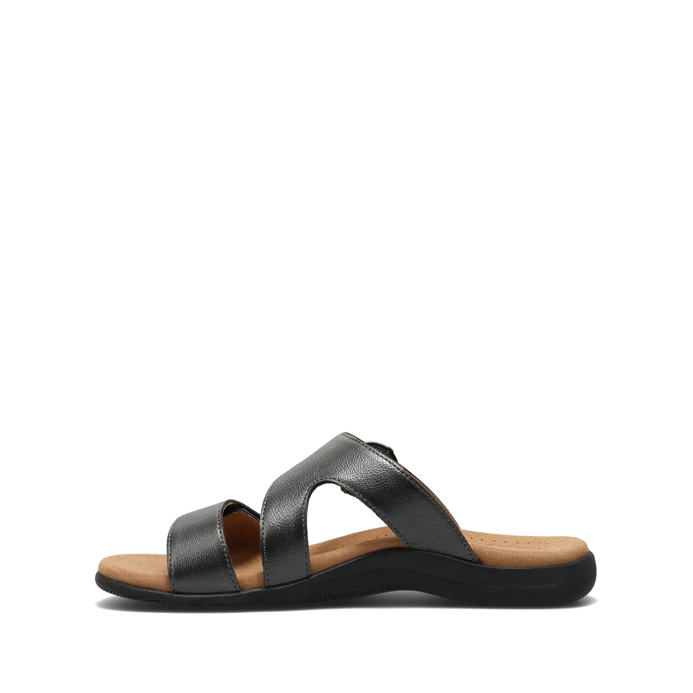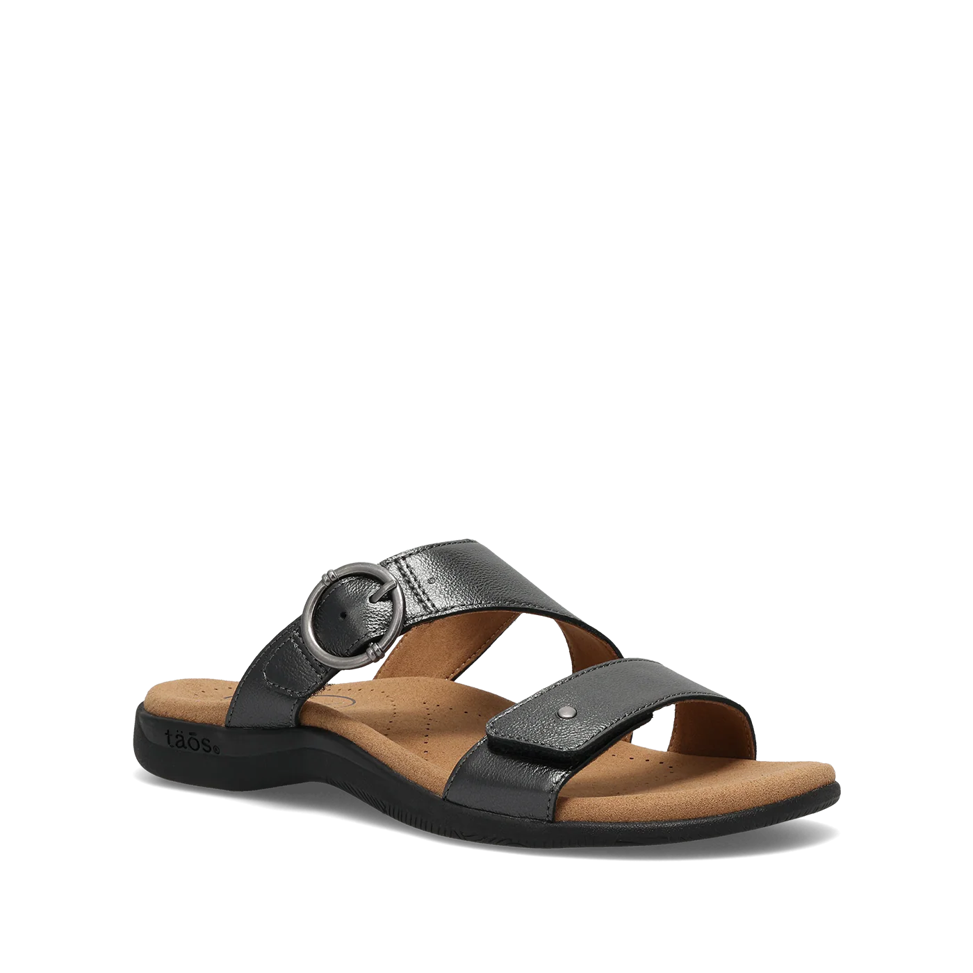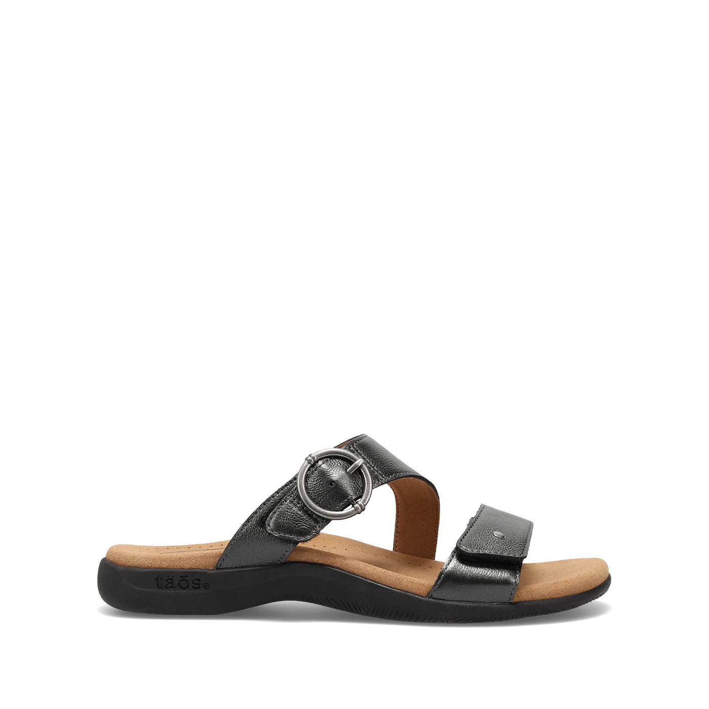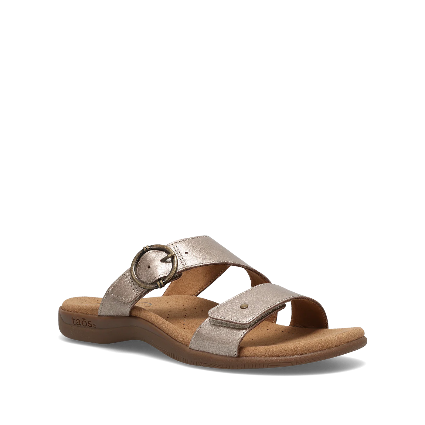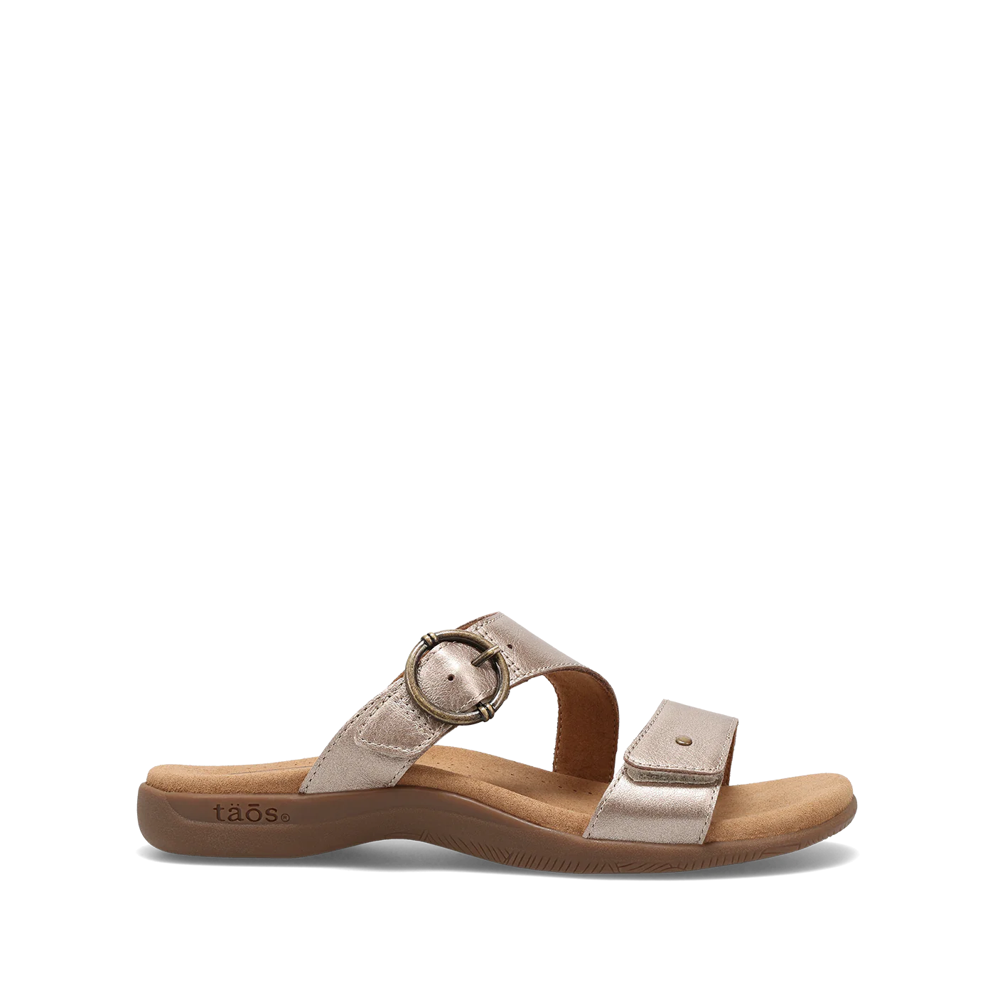 Meet your new go-to sandal, where on-trend styling meets Taos quality and support. Westside features beautiful soft metallic leather for a subtle, eye-catching shimmer, with soft leather lining that delivers a rich, luxurious feel against your skin. Two adjustable hook-and-loop straps with a decorative buckle offer a custom, secure fit with a touch of playful detail. Designed for all-day wear, Westside showcases our signature SOFT SUPPORT™ sandal construction with Soft Cool Recovery Foam® cushioning for exceptional arch support and shock absorption. An embossed microfiber footbed treated with an antimicrobial shield helps keep your feet cool, dry, and fresh. Finished with a flexible, durable rubber outsole for confident, long-lasting wear, this is the sandal that takes you everywhere in comfort and style.