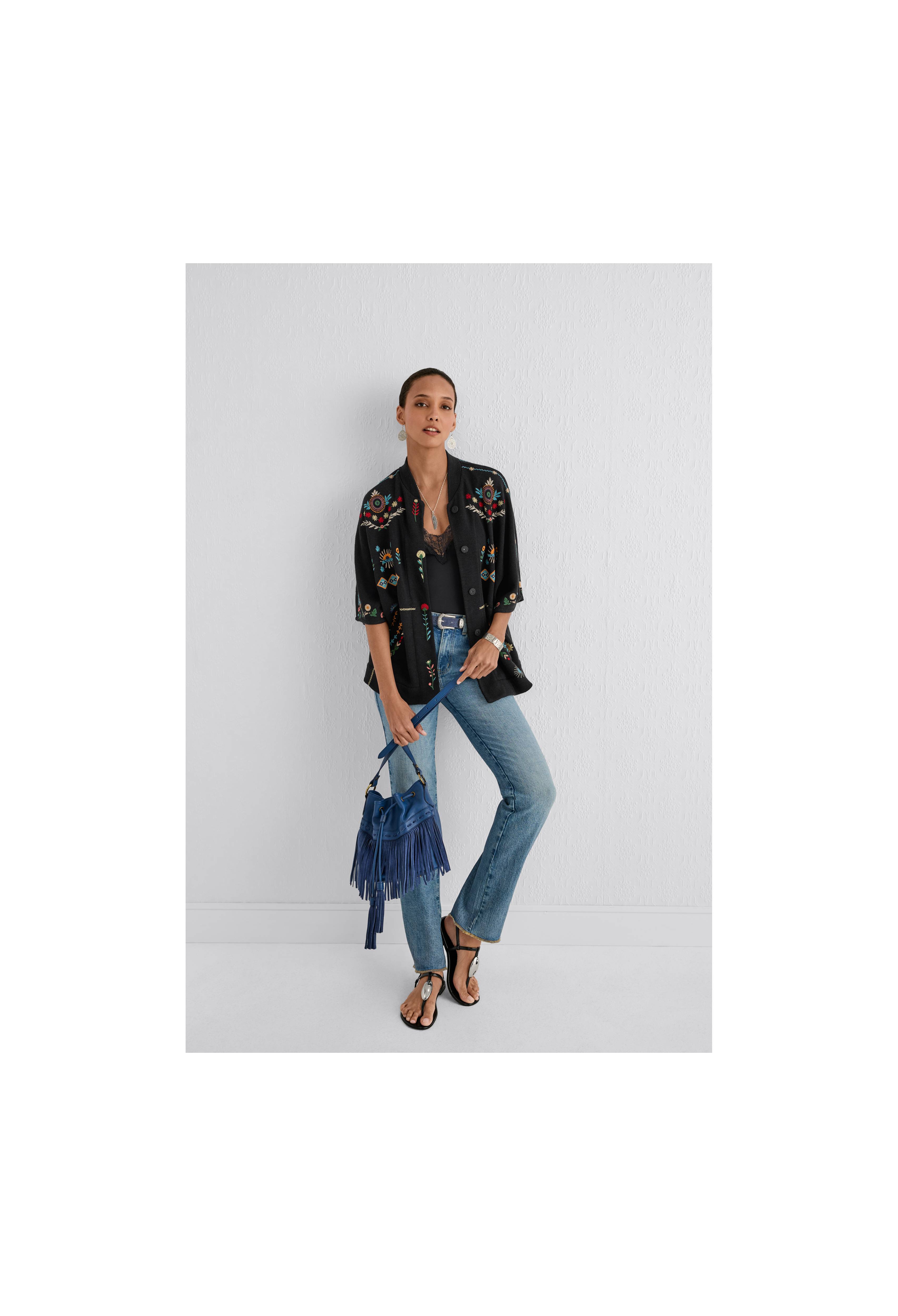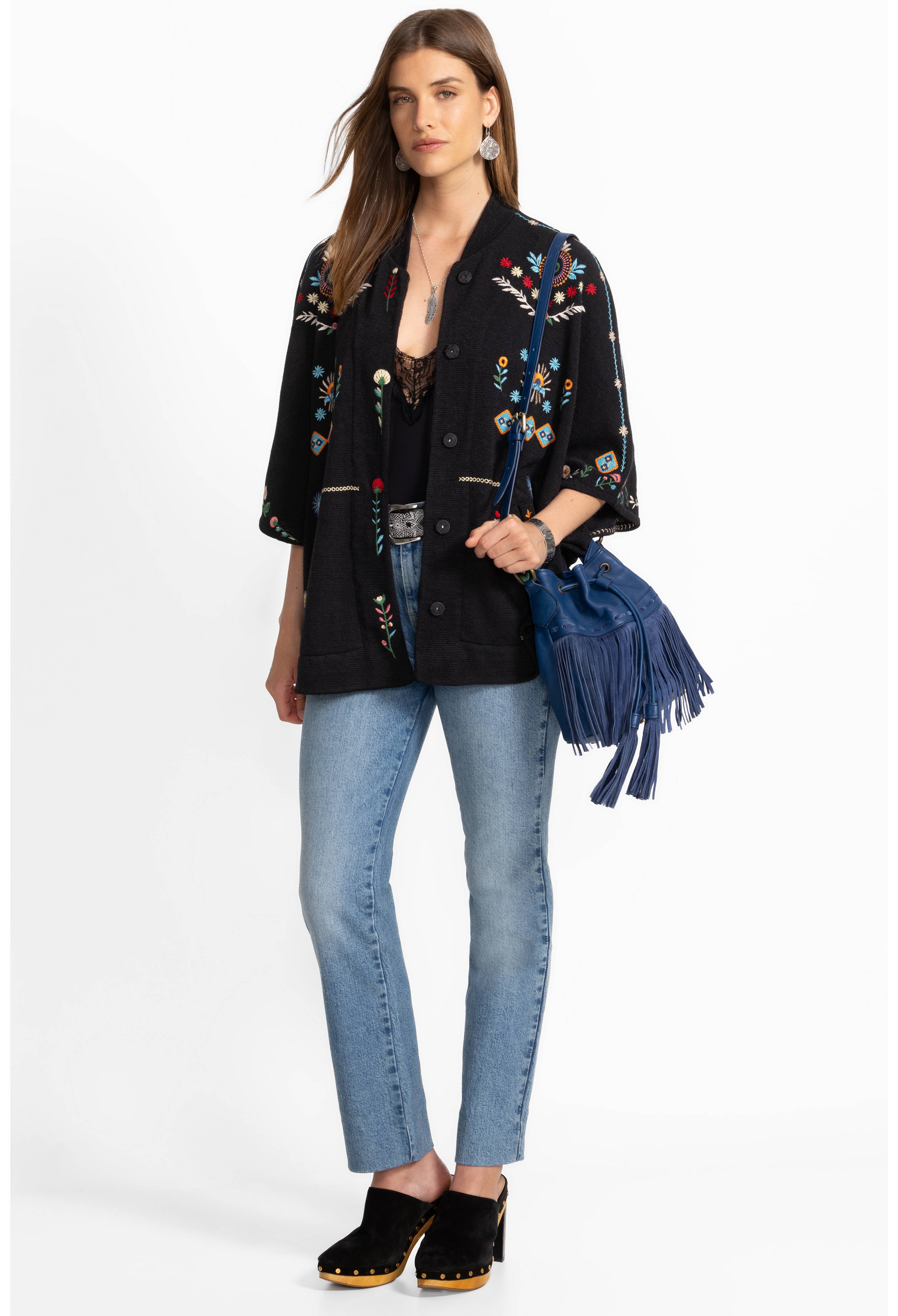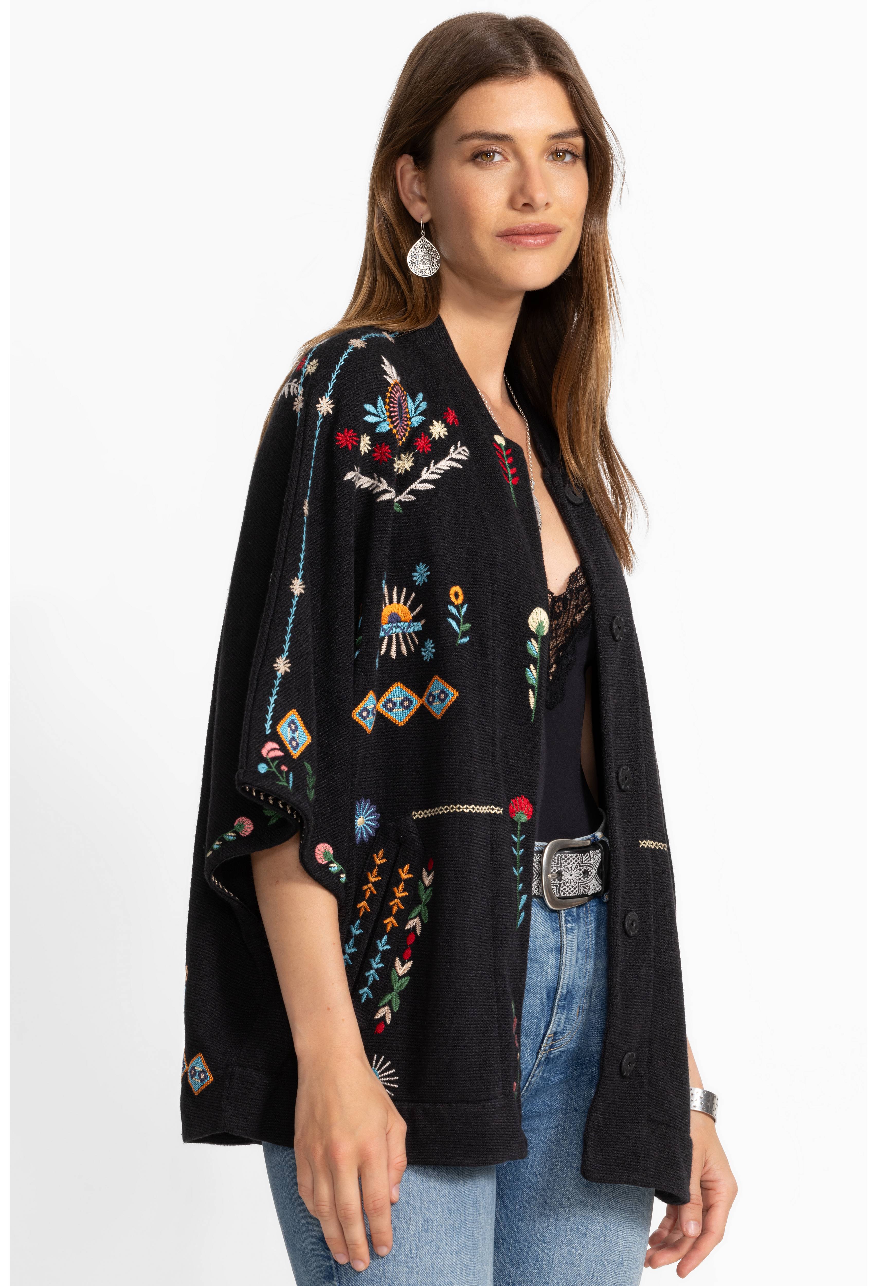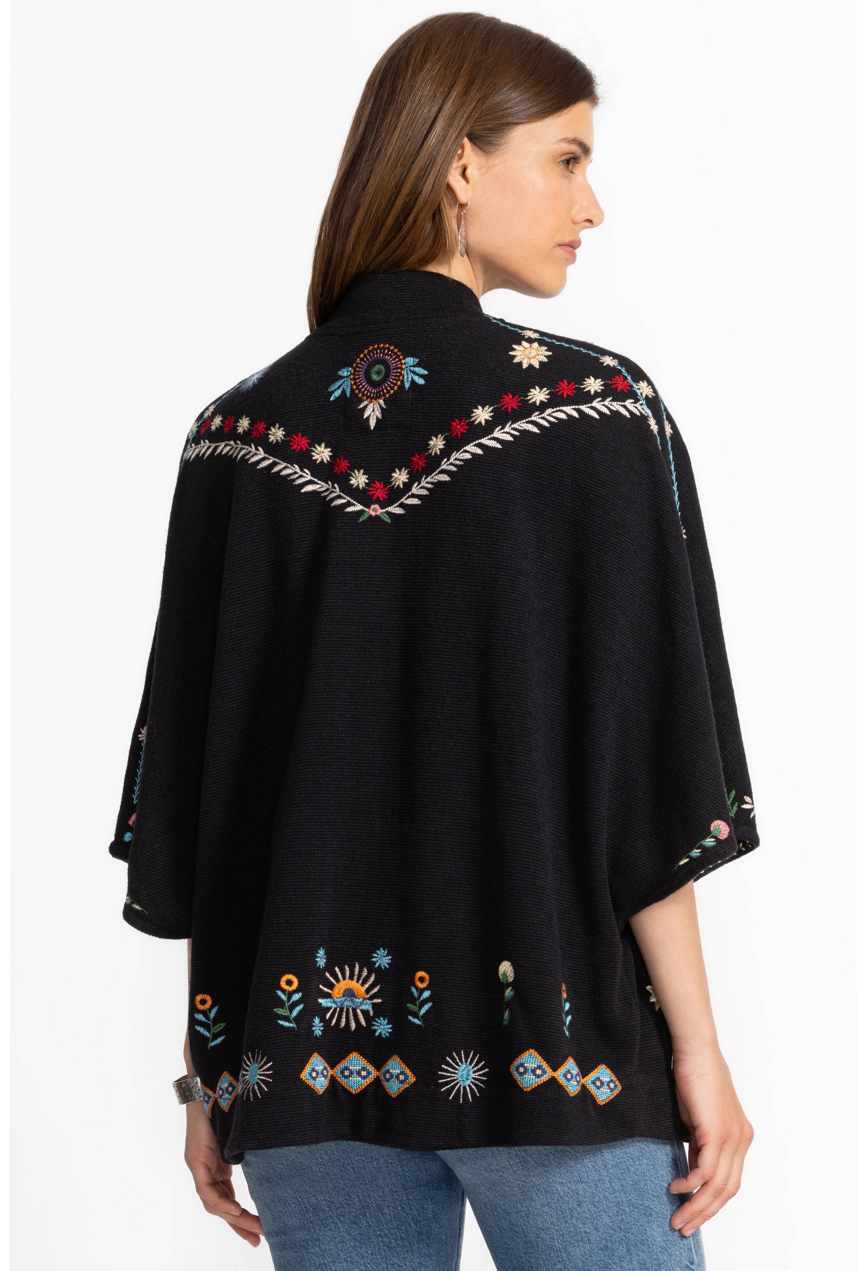 Adorned with colorful embroidered detailing, the Josiy Poncho is a vibrant layering piece. Designed with a snap front closure and 3/4 Dolman sleeves, this bold jacket is finished with convenient slip pockets at the sides. Layer over a casual sweater and pair with relaxed-fit jeans for an evening out with friends.