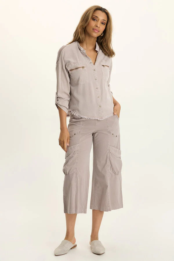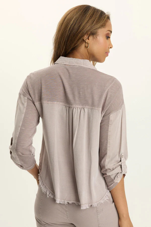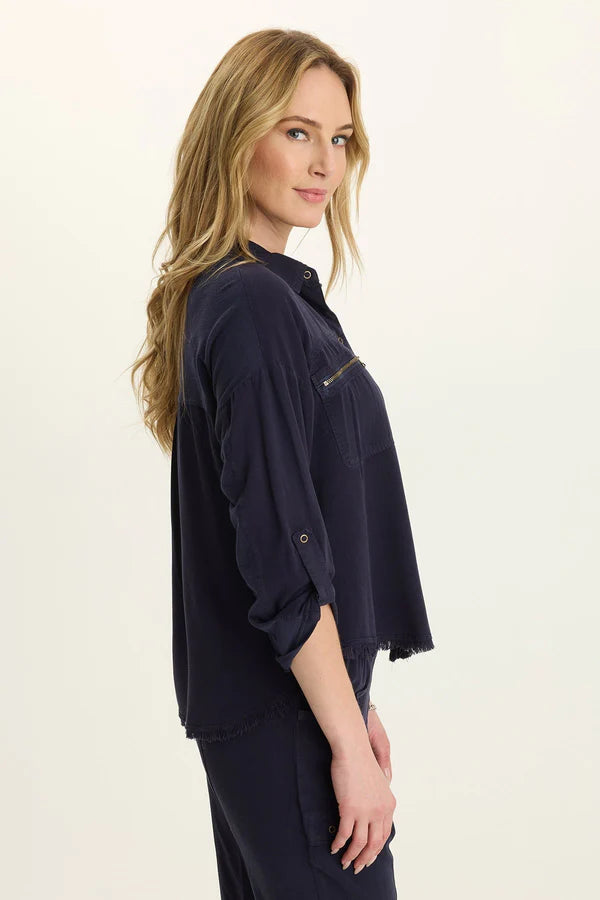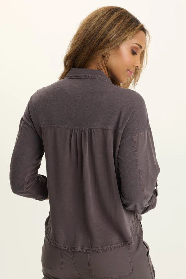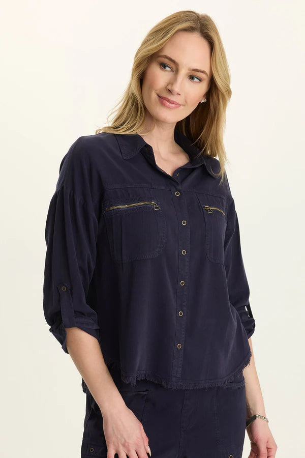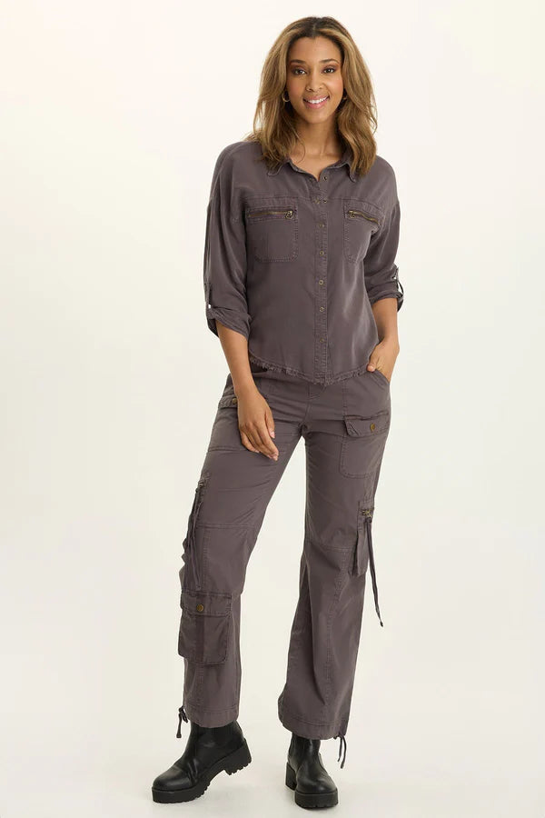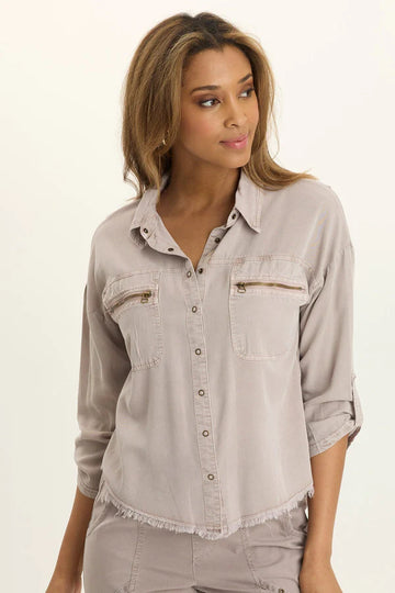 Tabbed three-quarter sleeves, zippered breast pockets, a classic collar, and a raw-edge hem round out this utility-inspired cargo shacket.