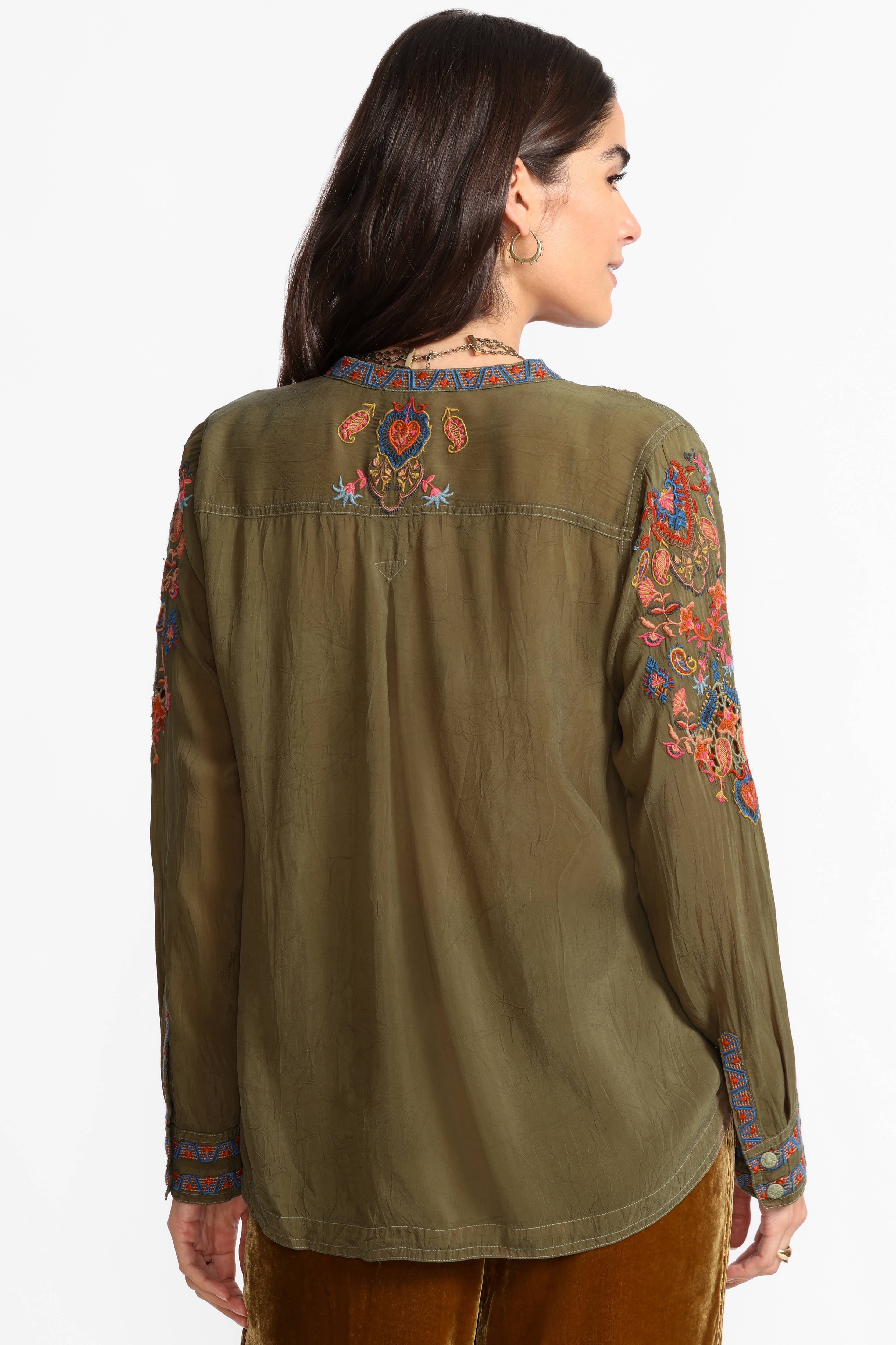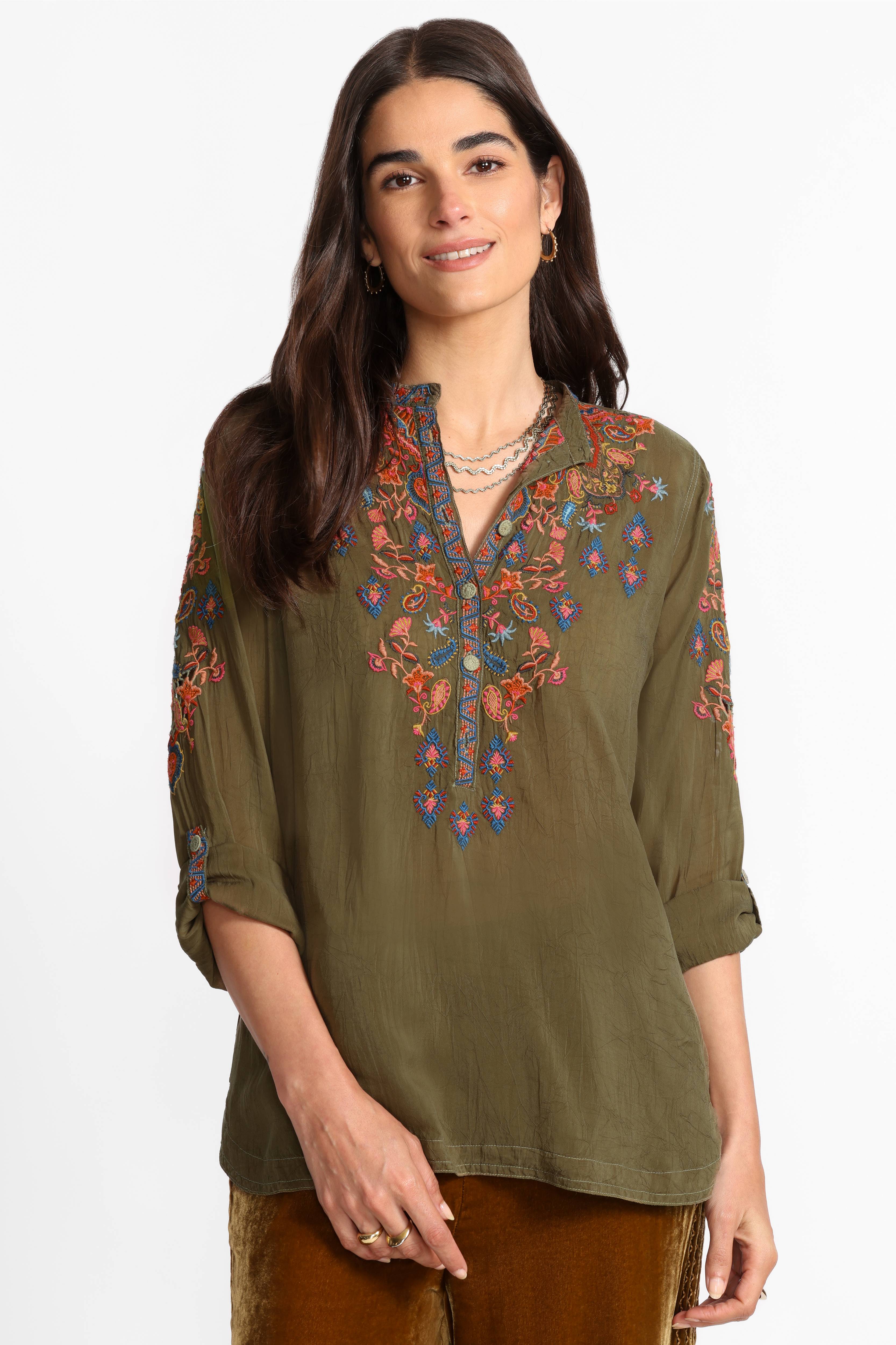 Crafted from a lightweight breathable fabric, the Alba Blouse is adorned with an intricate floral pattern imbued with vibrant color. Designed with a Henley neckline and roll-tab sleeves, this top is finished with a curved hemline and intricate embroidered detailing. Pair with relaxed-fit jeans and fashion sneakers for a fresh casual weekend look.