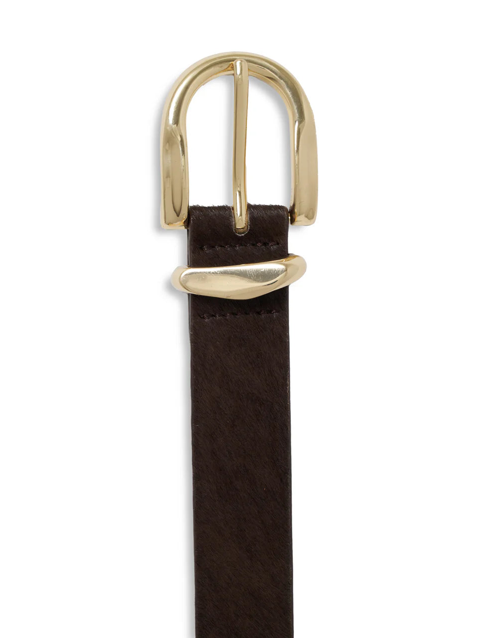 The Sanctuary Clothing All Day Calf Hair Belt in Choco Brown features a dark brown calf hair finish and a shiny gold oval buckle.