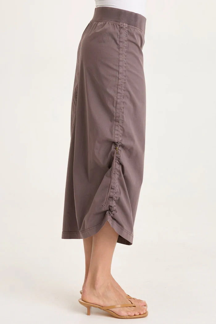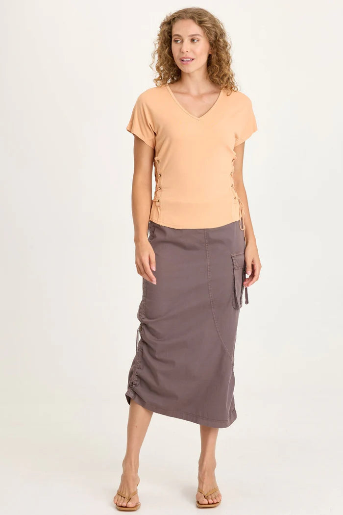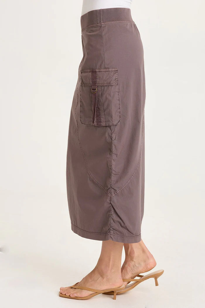 Bindi is an asymmetrical, side cinch midi skirt with one oversized cargo pocket and an elastic waistband.