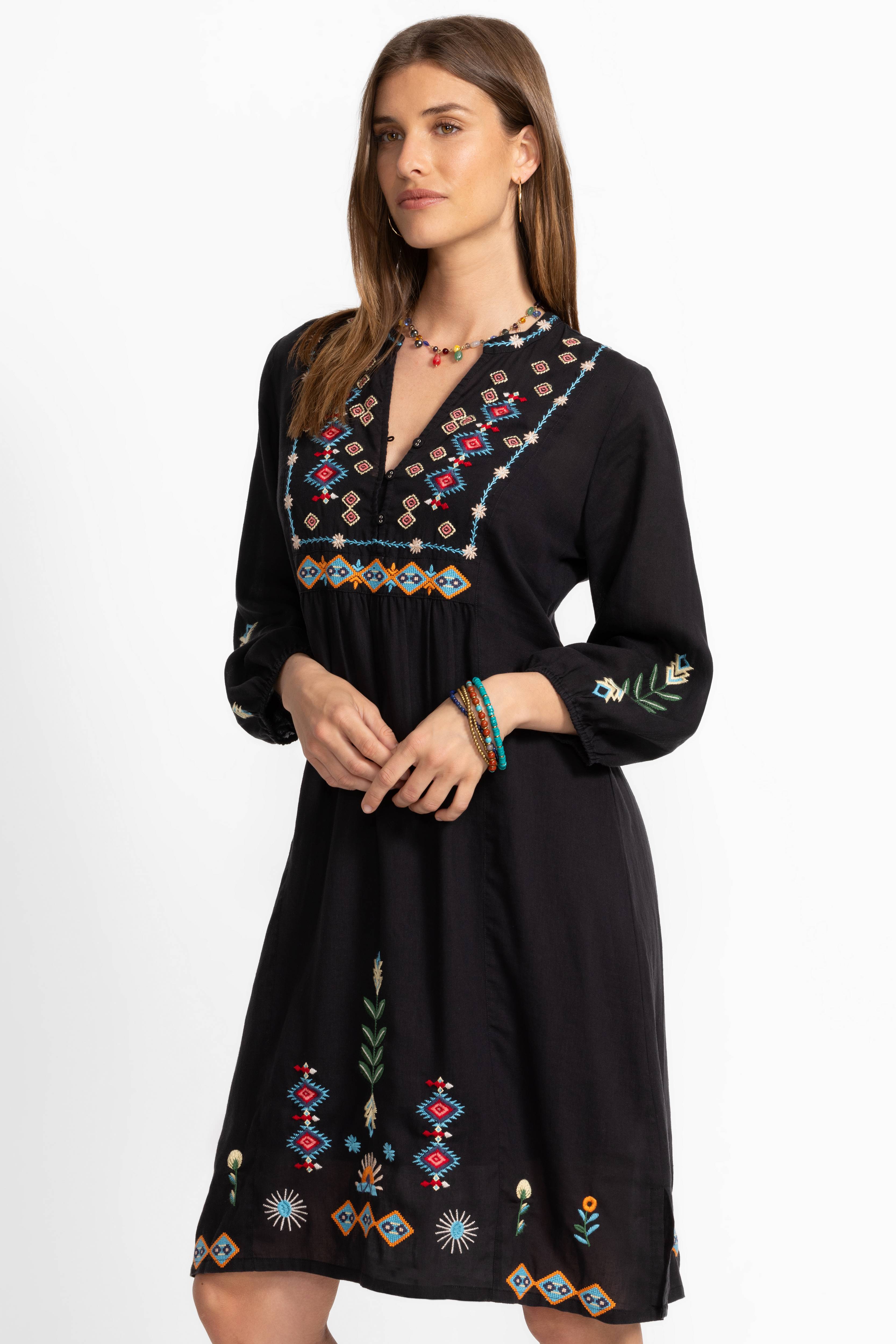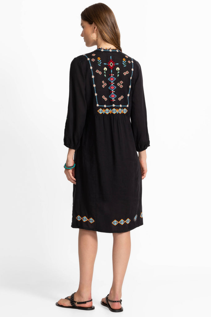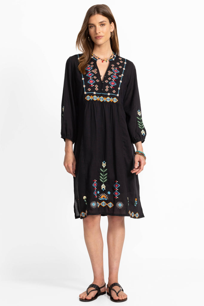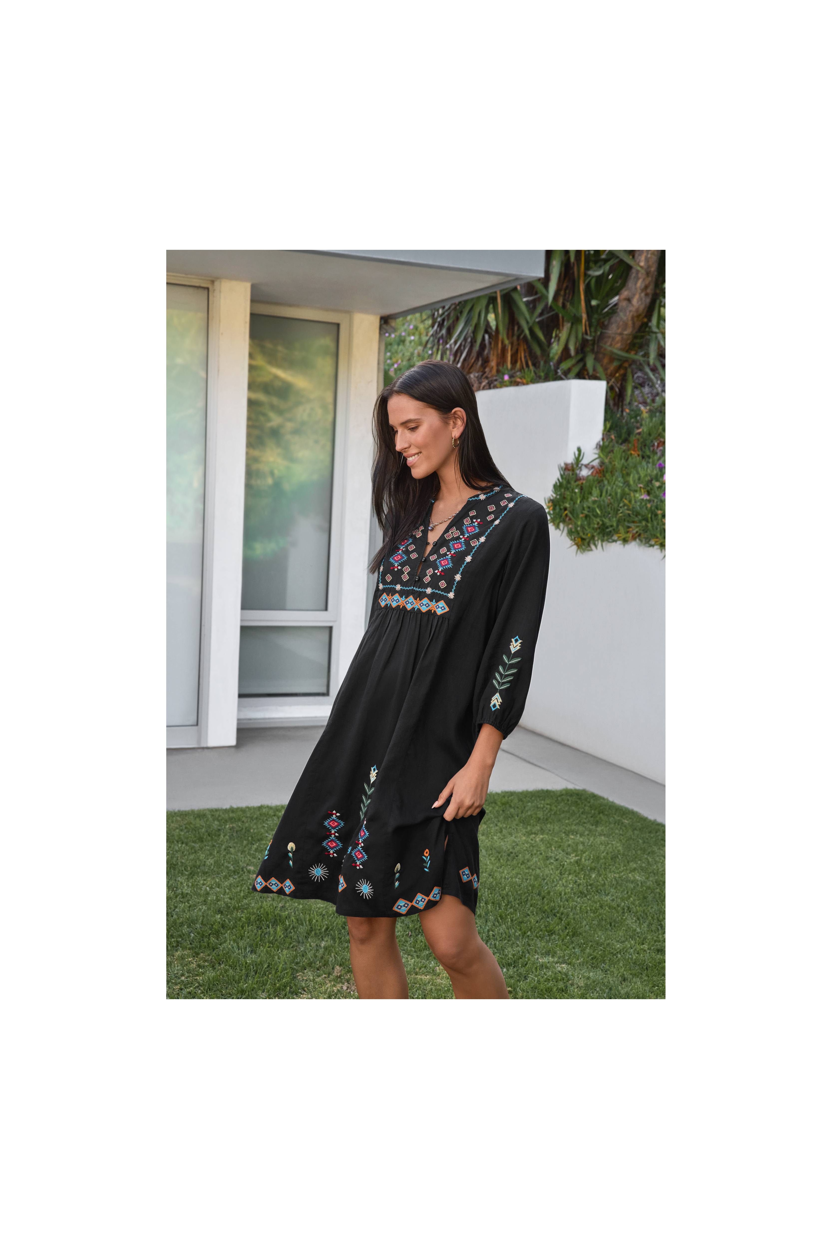 The Josiy Button Front Yoke Dress is crafted from a lightweight flowing fabric and is intricately detailed with beautiful floral embroidery. Designed with a split V-neckline and dropped shoulders this 3/4 sleeve dress is finished with a relaxed A-line shape for an easy silhouette. Pair with casual sandals and a cross-body bag for a day of sightseeing.