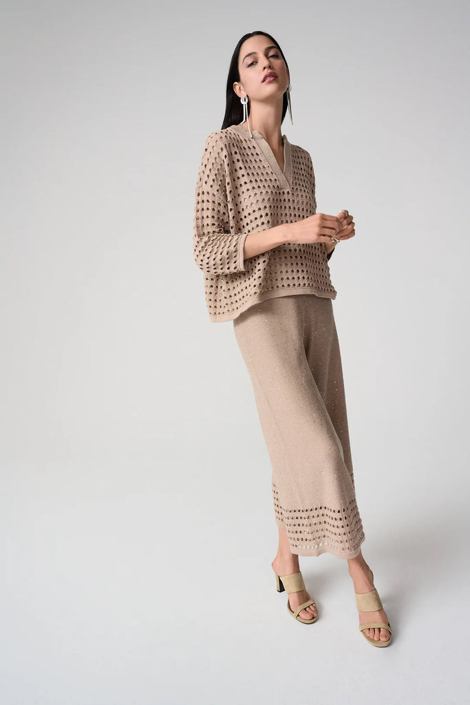This Joseph Ribkoff sweater combines a cotton blend with sequined yarn for a subtle shimmer in its open stitch design. Featuring a notched V-neckline and three-quarter sleeves, the boxy silhouette offers a relaxed yet refined look. Perfect for layering, it adds effortless elegance and comfort to any contemporary wardrobe.
