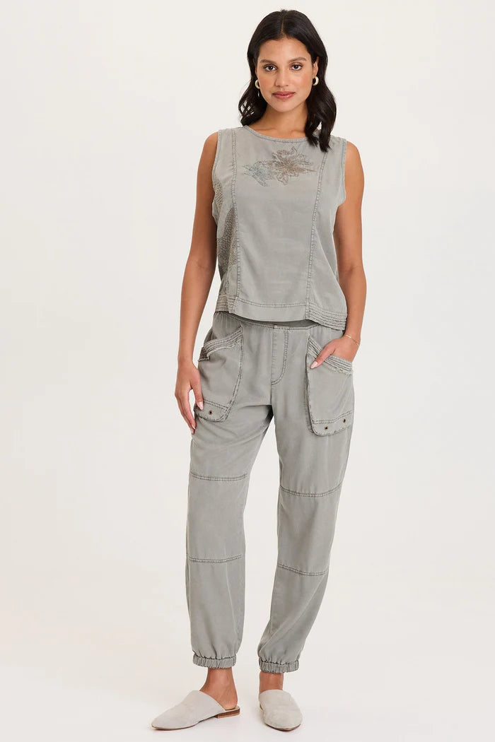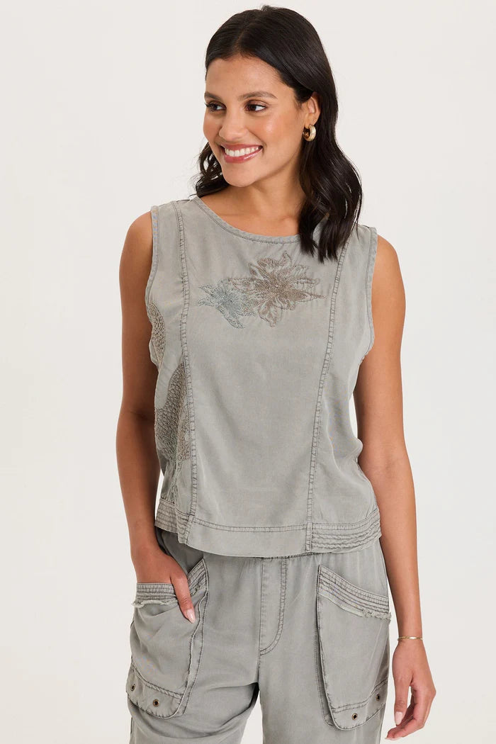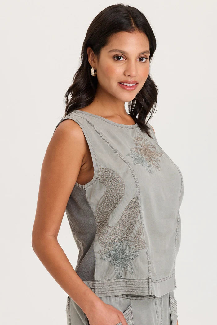 Embroidered floral and scale design caress the front of this structured tank. Featuring a twill front and back with jersey contrast back panels.