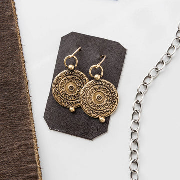 - Yellow bronze tapestry pendant, approximately ¾ inch by 1 inch